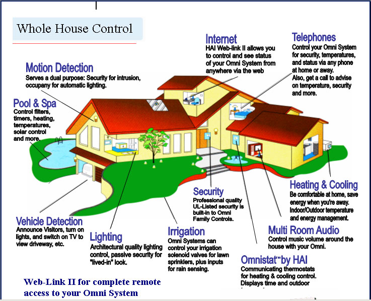 Home Automation is a very nice way to add a few conveniences or many if you choose to your home. Below is an illistration of some of the features you can have added to your home. If you choose HAI your security system and/or cameras will be integrated to work within it. We install Omni products for this type of system.